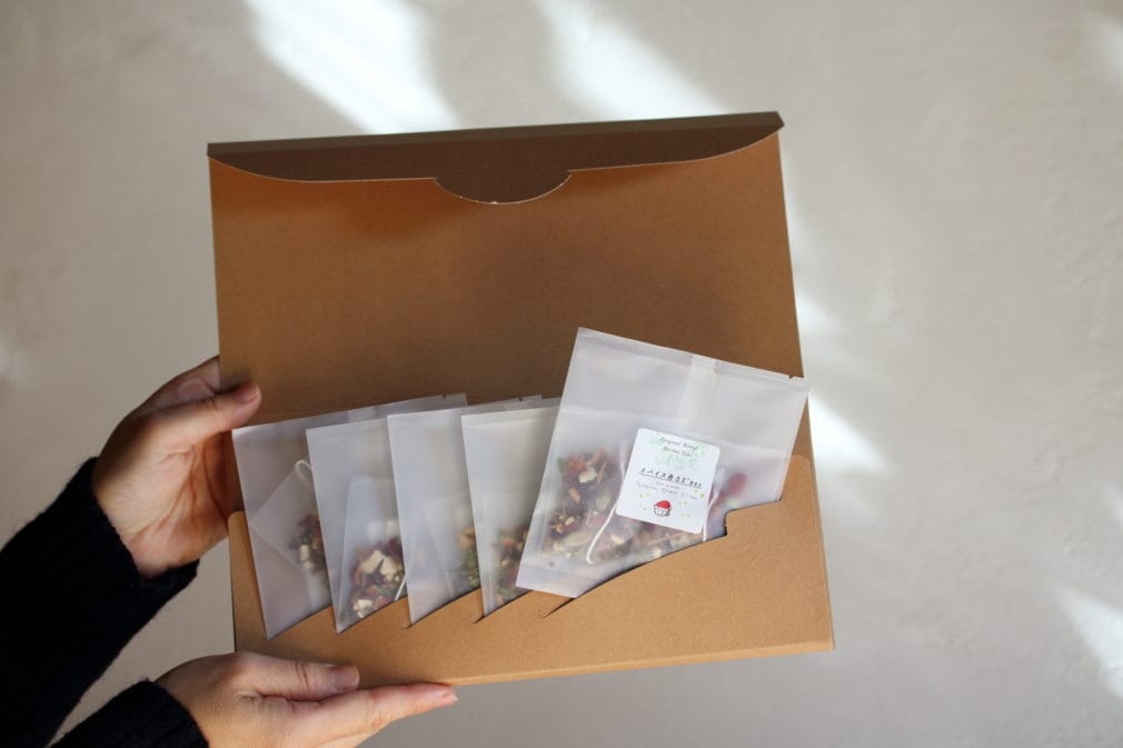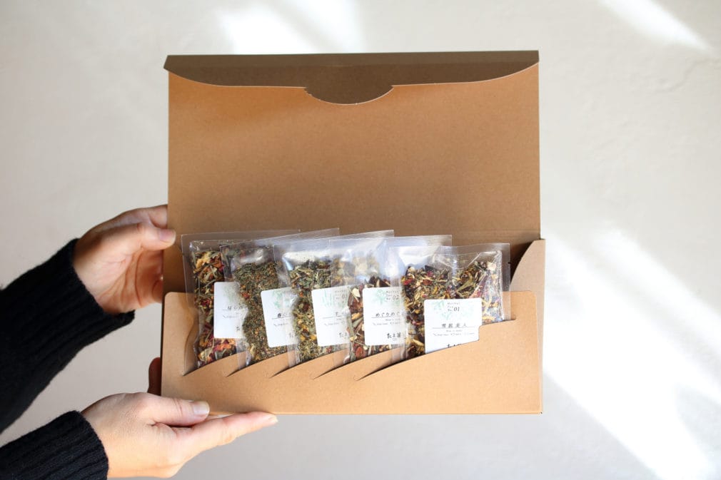 たま茶では、常時20種類ほどのオリジナルブレンドハーブティーをご用意しています。店頭では試飲を通して、お客様の好みや気分に寄り添いながらご提案をしていますが、遠方の方や初めての方にも気軽に楽しんでいただけるように、オンライン限定のお試しセットもご用意しました。